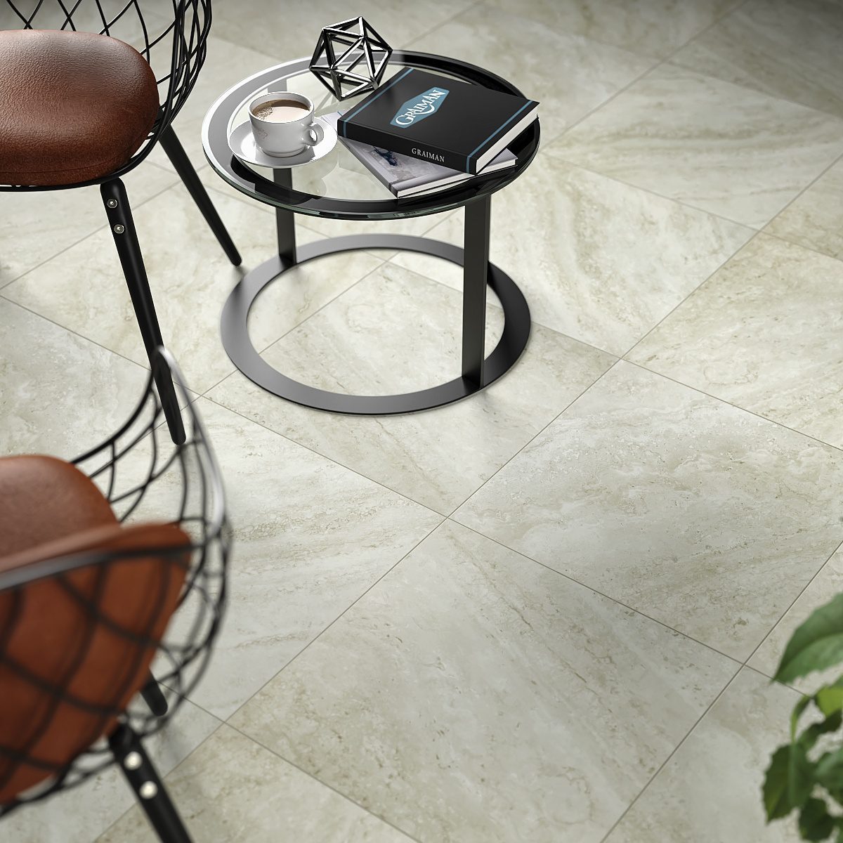 A travertine looking ceramic tile with texture for your floor, and a corresponding wall tile.