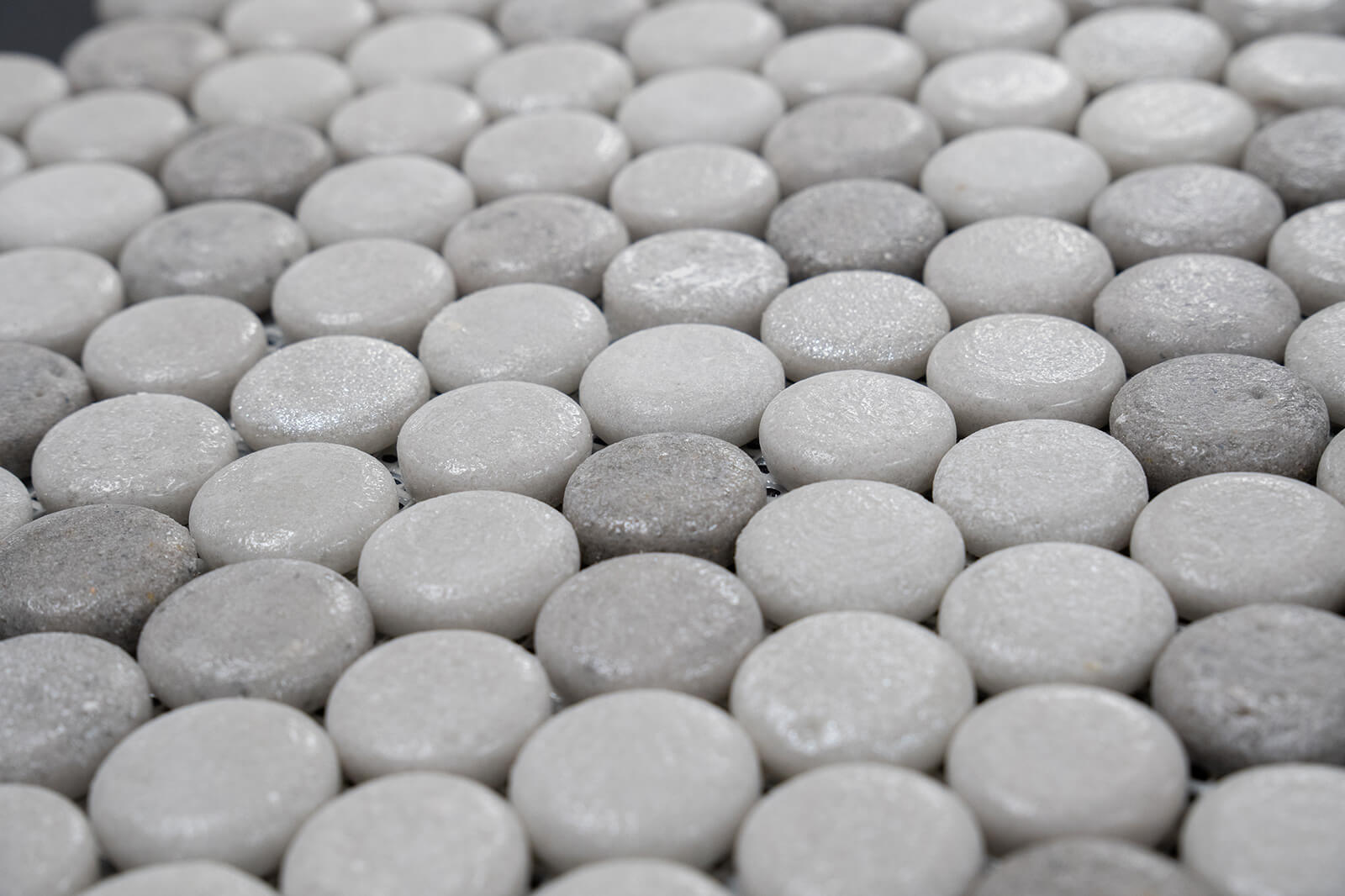Crafted from recycled glass, Cascade offers a modern, eco-friendly surface in two distinctive shapes. Droplets feature refined penny-round mosaics, while Stones present an organic pebble style, each bringing rich color and luminous depth to walls and accents. Durable and low-maintenance, Cascade requires no sealing and cleans easily, making it a stylish and sustainable choice for contemporary interiors.