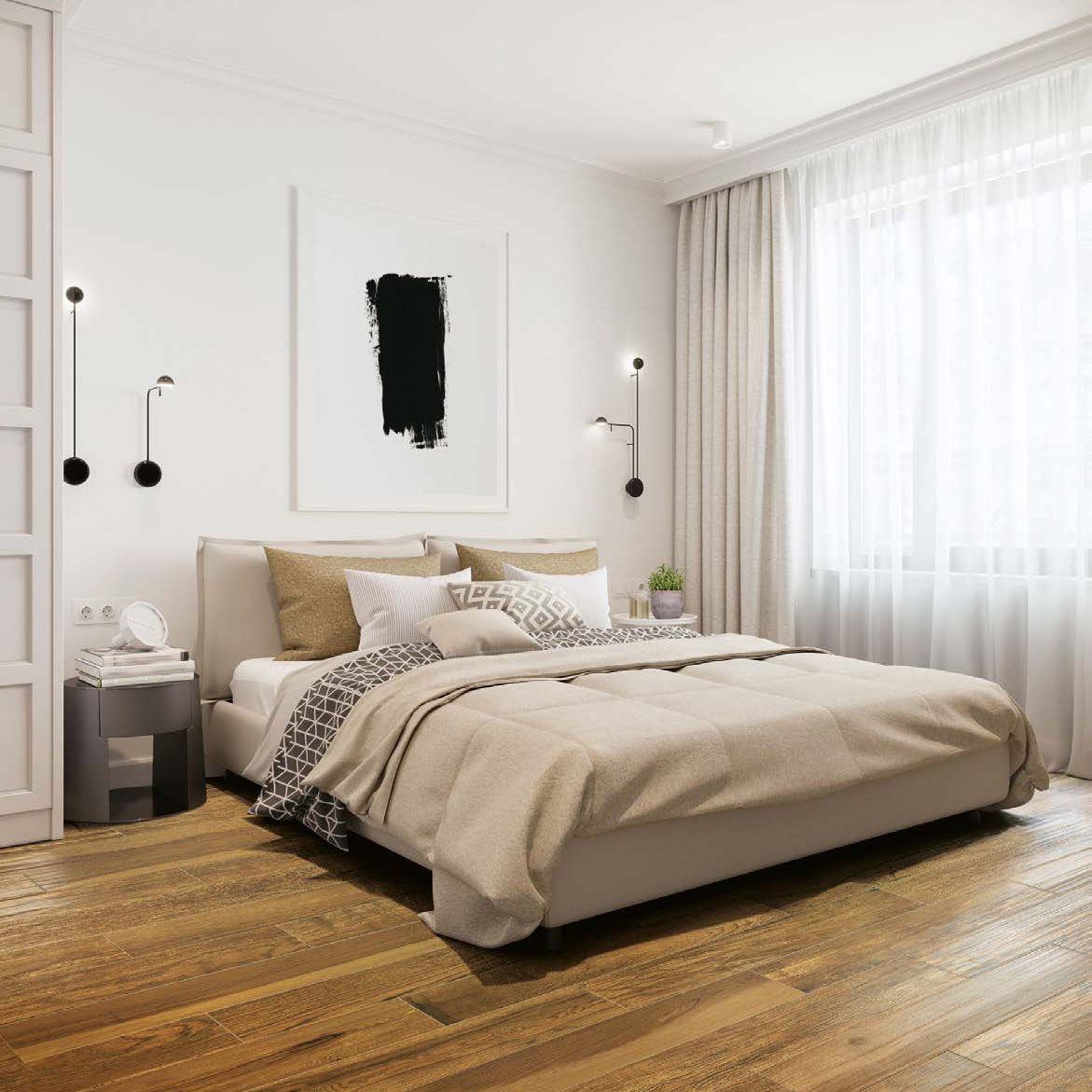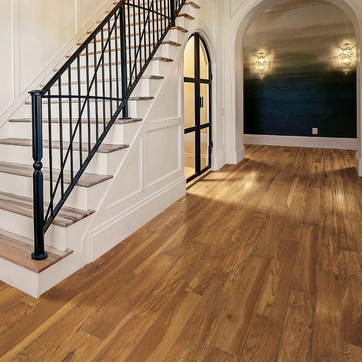 A glossy wood look porcelain tile complements the woods character and natural structure. Making a statement of elegance and subtle sophistication.