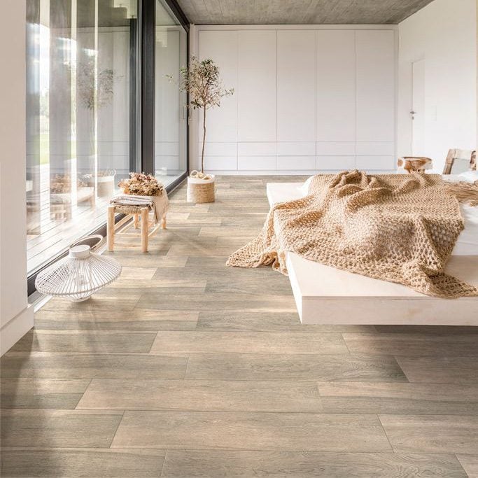 A wood looking porcelain was created with earth elements in mind to create an organic look with a smooth woodgrain finish to this rectified porcelain.